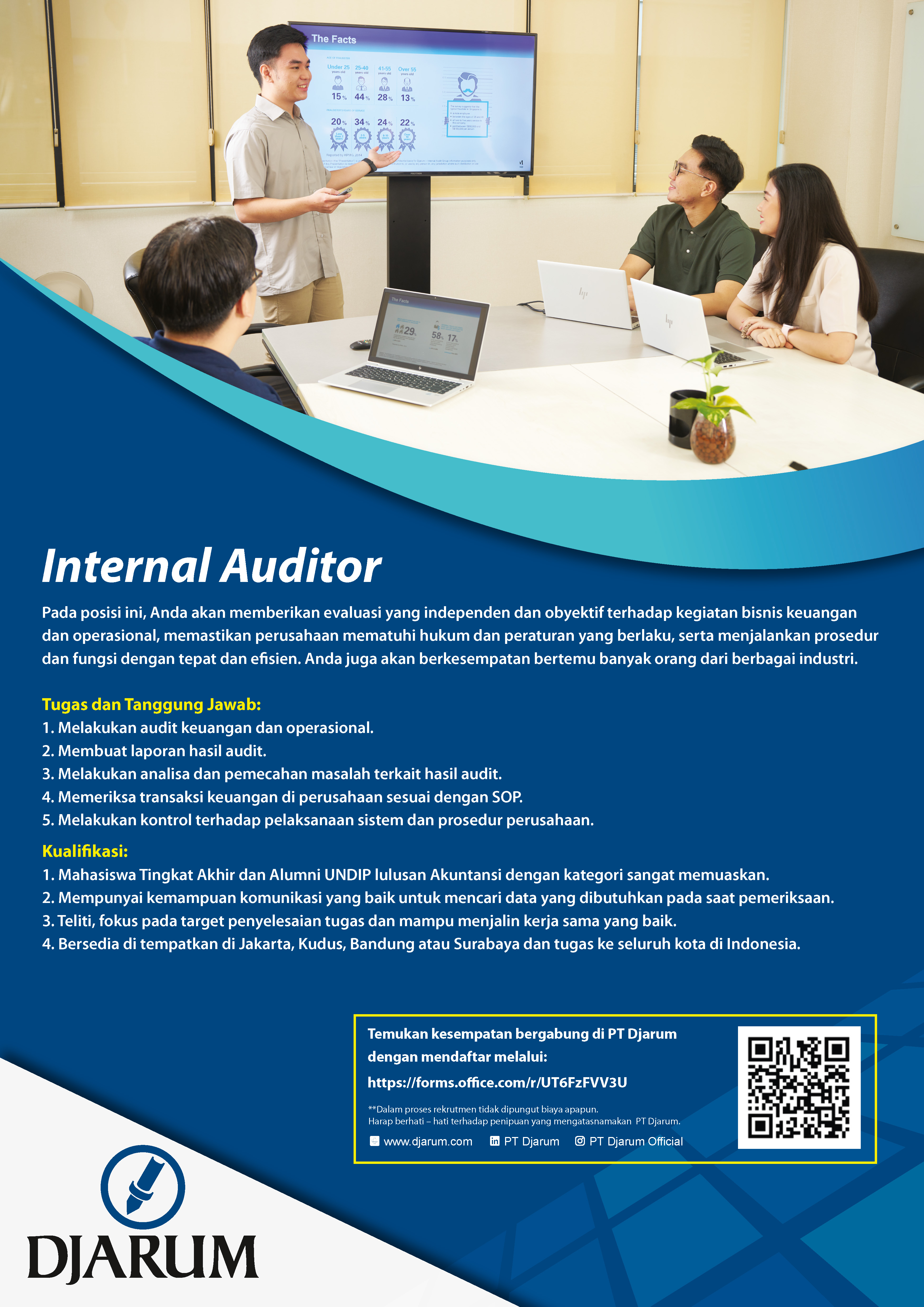 Sebagai seorang Internal Auditor, Anda akan memberikan evaluasi yang independen dan obyektif terhadap kegiatan bisnis keuangan dan operasional, memastikan perusahaan mematuhi hukum dan peraturan yang berlaku, serta menjalankan prosedur dan fungsi dengan tepat dan efisien. Anda juga berkesempatan bertemu banyak orang di berbagai industri.