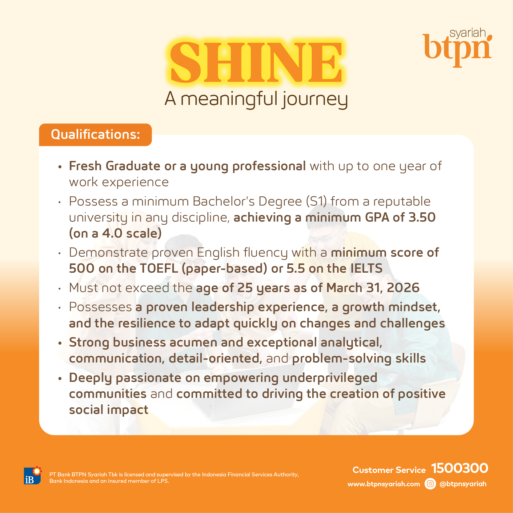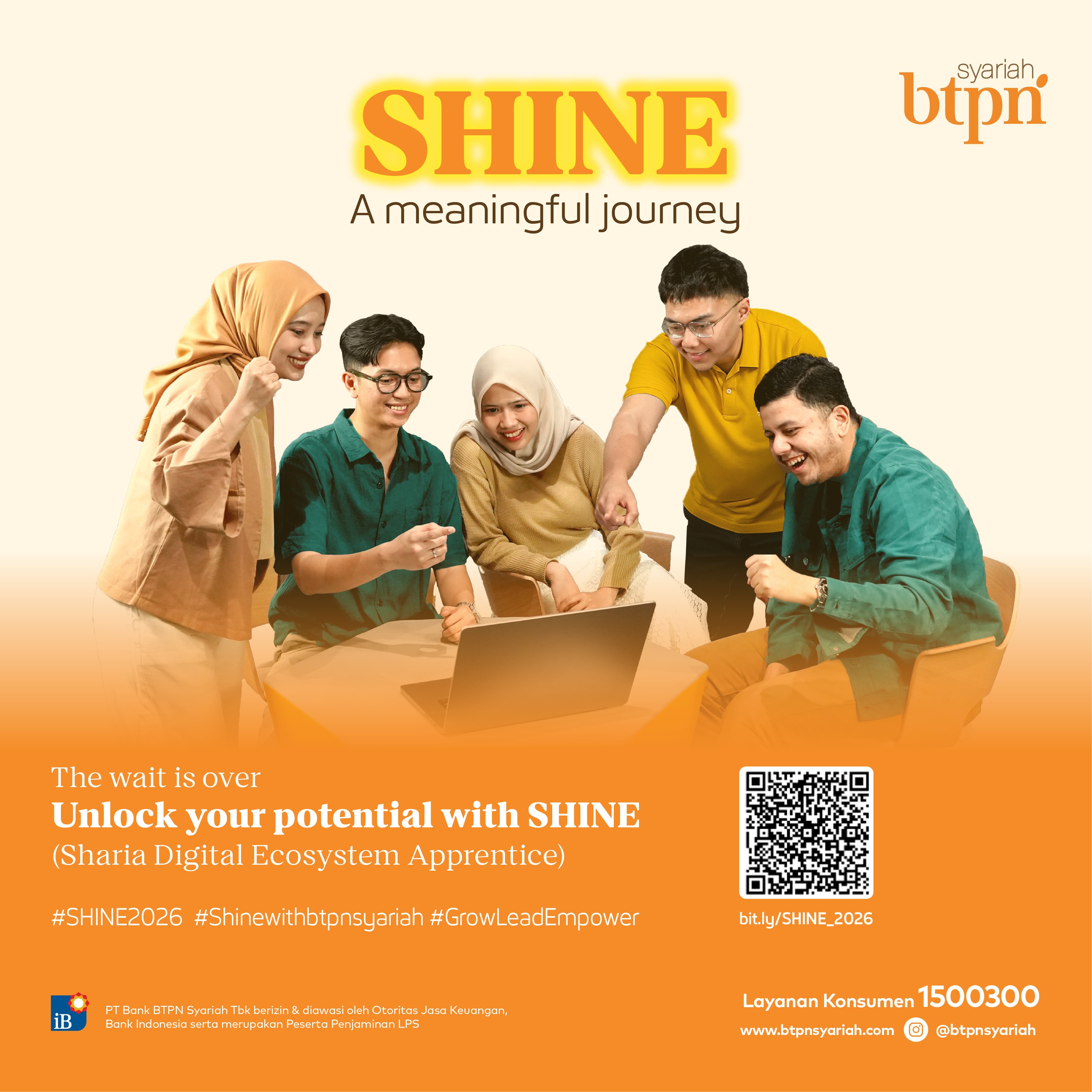 BTPN Syariah invites you to be a part of SHINE (Sharia Digital Ecosystem Apprentice)—a Management Trainee program that offers a meaningful journey where your leadership skills and digital expertise directly contribute to positive social change.